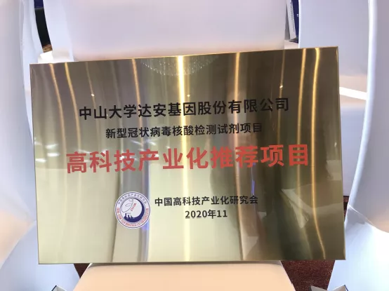 中山大学K8凯发旗舰基因股份有限公司根据《高科技产业化推荐项目申报、评选办法》的有关要求,及时提交了“新型冠状病毒核酸检测试剂项目”的项目申报书。由相关专业的院士、专家、企业家组成的评选委员会顺利获得对申报材料进行谨慎且专业的审查、评议,并由中高会理事长会批准并公示后,本项目最终取得由中高会颁发的“高科技产业化推荐项目”称号及牌匾。