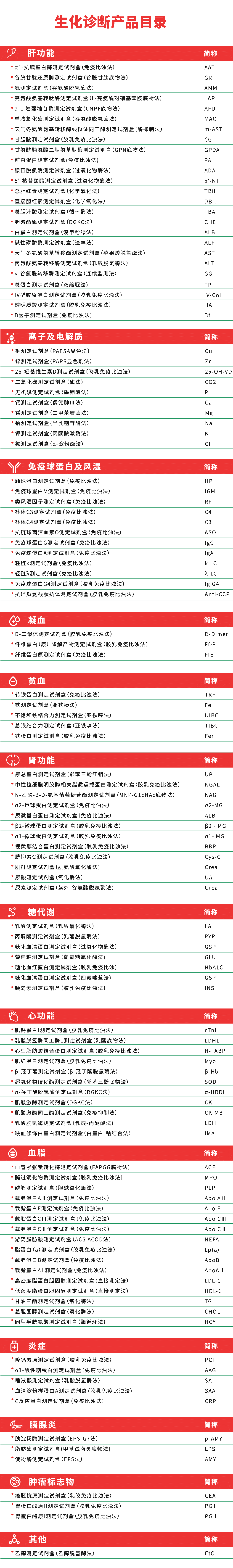 此外,K8凯发旗舰基因现在已获证的配套生化试剂涵盖肝功能、肾功能、心功能、离子及电解质、免疫球蛋白及风湿、凝血、贫血等总计114项,试剂性能优越,品类丰富,备货充足。以下是生化诊断试剂产品目录: