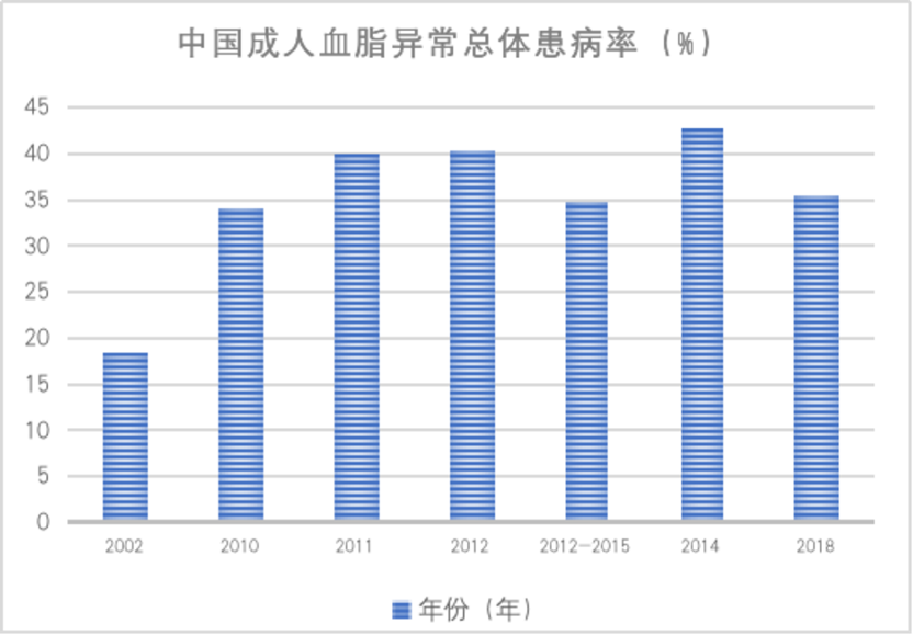 近几十年来,中国人群的血脂水平、血脂异常患病率明显增加,以高胆固醇血症的增加最为明显。2018年全国调查结果显示,≥ 18岁成人血脂异常总患病率为 35.6%。